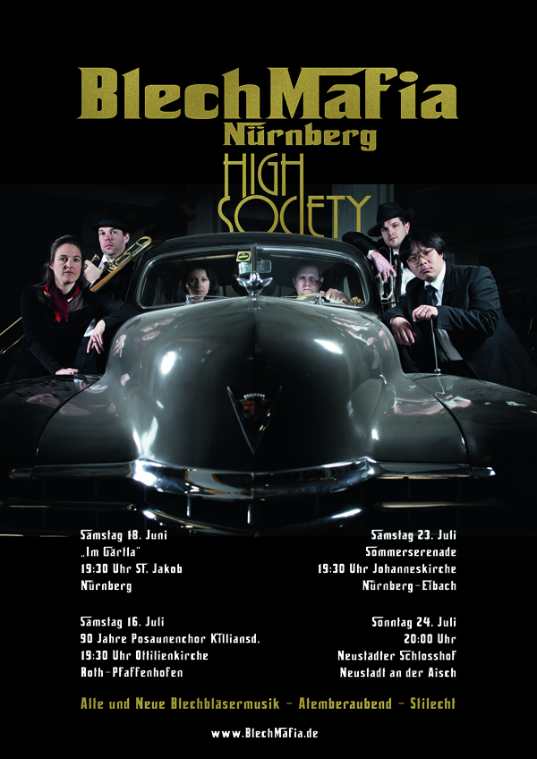 Klang-Auftrag: 414.01.P Mit ihrem ersten Projekt: „Klang-Auftrag: 414.01.P“ konzertieren die Mitglieder der BlechMafia Nürnberg diesen Sommer in Nürnberg, Postbauer-Heng, Brand-Erbisdorf. |